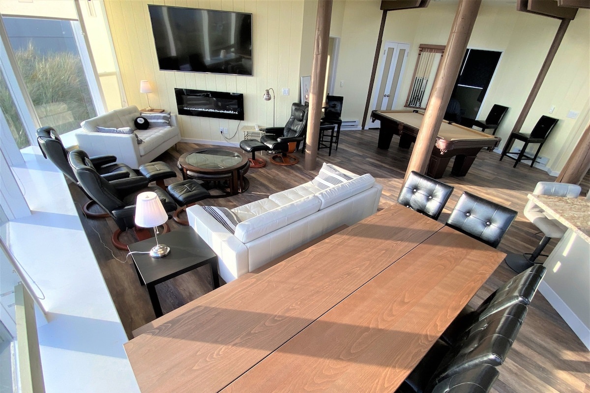 - Amazing center atrium LOUNGE with pool table (beat up) under a NEW regulation ping pong topper, adjoining kitchen and living area with pub tables/stools and its own tv